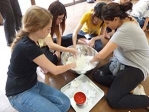 午前中は、小菅村出身の学生スタッフのお祖母さんの家でこんにゃく作り体験。できあがったこんにゃくはとてもおいしかったです。こんにゃくいもをミキサーにかけたものをかきまぜ、ねかせておく間、お祖父さんの案内でわさび田を見学しました。