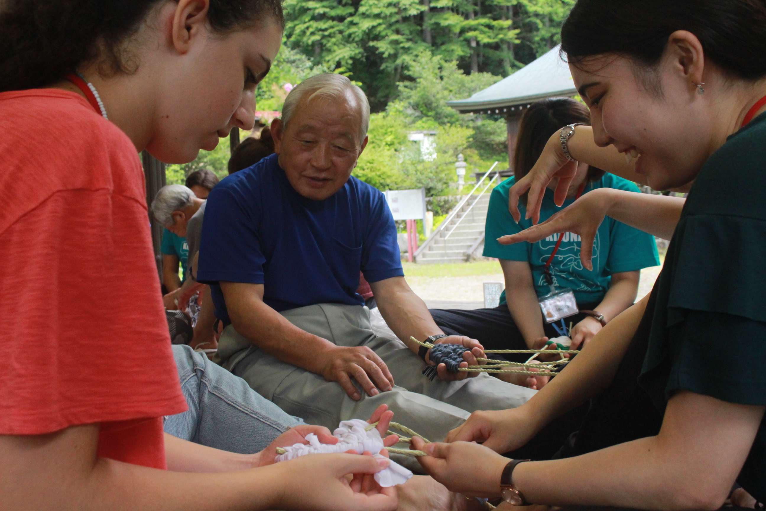 小菅中学校がこの日を登校日にして受け入れてくださっての交流プログラム。中学3年生が、小菅村や日本文化について英語で紹介した後、全員で大きな輪になって、小菅音頭を踊りました。息を合わせないと下ろせないフラフープのゲーム、フルーツバスケットやジェスチャーゲームで楽しんだ後、大きな模造紙にメッセージを寄せ書きしました。教頭先生に案内いただいての校内見学は、イスラエルやパレスチナの学校とまったく違う日本の学校に興味津々。日本の学校では、生徒が校舎を掃除することに驚いていました。夕方からはホームステイ。村の方々のお宅で、忘れられない楽しい時間を過ごすことができました。