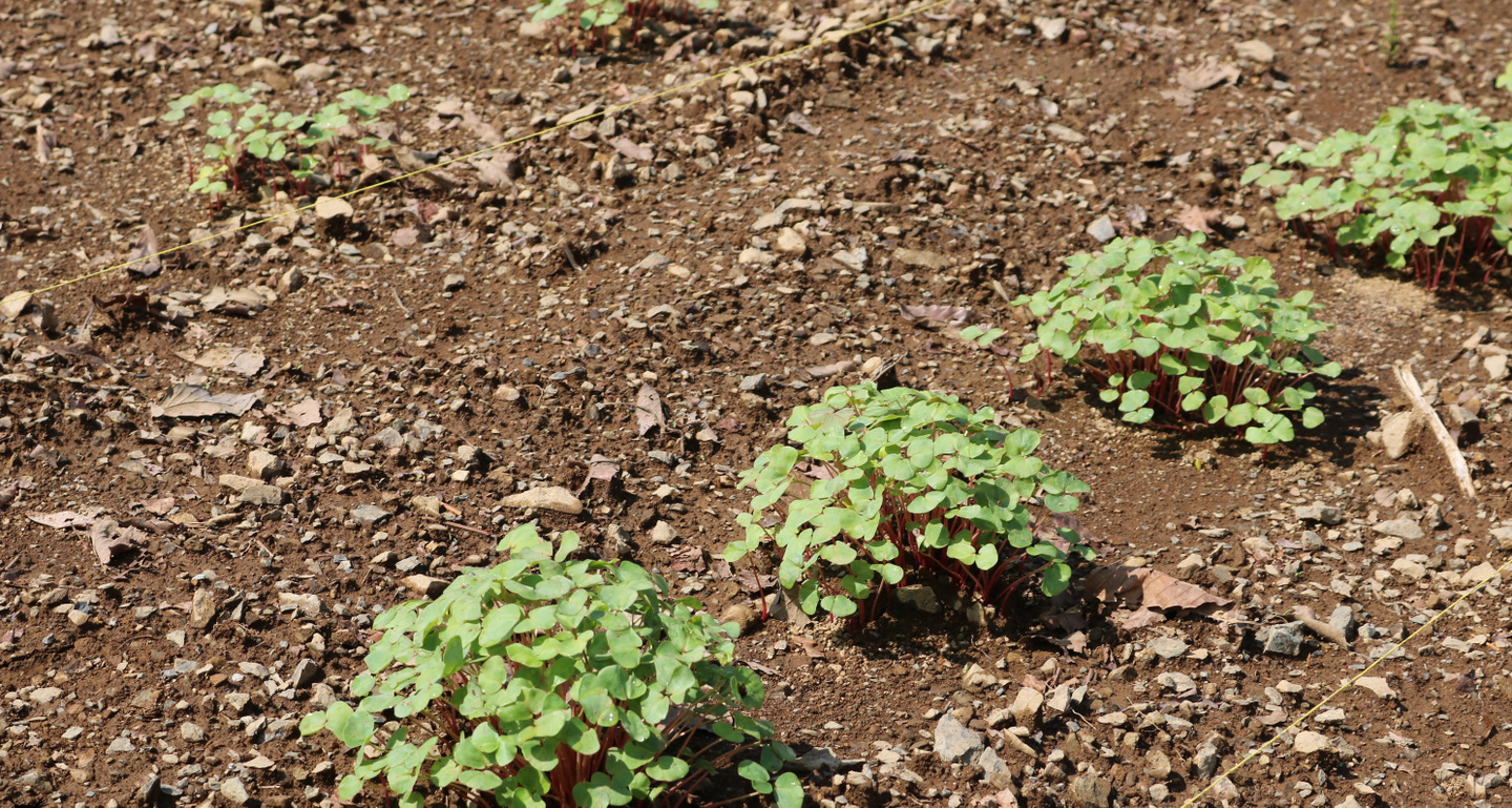 プログラム2日目にまいたそばが芽を出し、畑に見に行きました。自分でまいたそばの芽を見ることができて、感慨もひとしおです。守重ご夫妻にお世話をお願いすることになりますが、花を咲かせ、実になるのが待ち遠しい様子でした。