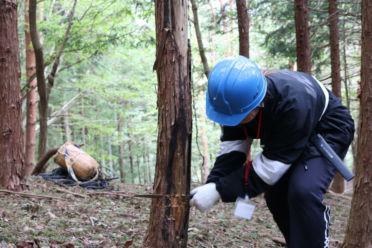 午前中は、守重敏夫さんと佐藤英敏さんにご指導いただき、森林管理作業を体験しました。今回は間伐の作業です。人が手を入れた森は、手を入れ続けないといけないこと、人口流出、高齢化で、先祖代々受け継いできた森を守ることが難しくなっている現実を知りました。一本の木を切るのも大変で、広大な森の手入れを定期的に行い、森を管理する作業がいかに大変かを実感しました。何本か木を倒し、枝をはらい、幹を1mくらいに切り揃えると、あいにくの雨。急いで寺子屋に戻り、お二人からさら